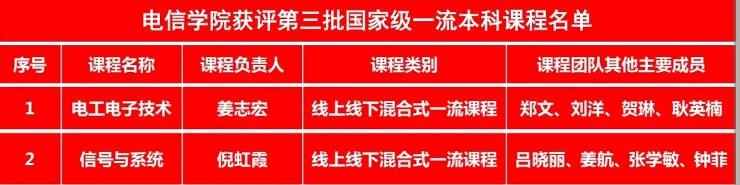 近日,教育部公布了第三批国家级一流本科课程,电信学院《电工电子技术》《信号与系统》2门课程成功获评线上线下混合式一流课程。